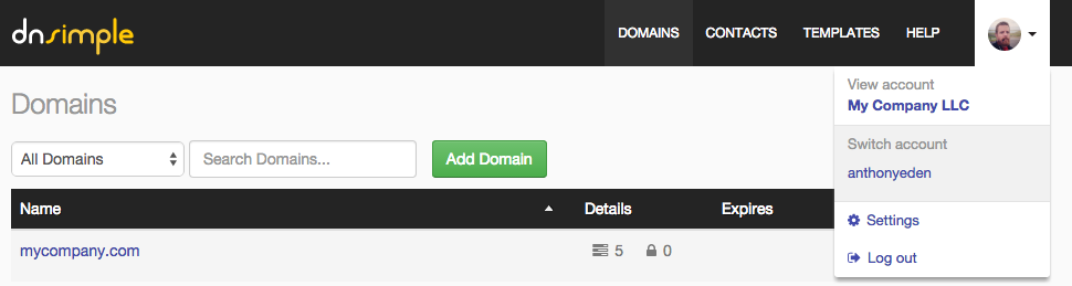 Starting today, every DNSimple customer may have multiple accounts that can be managed independently from a single user profile. For example, this gives you the ability to set up one account for personal use and one for business use. You could also have one account for each of your customers if you are managing domains and DNS on behalf of others.