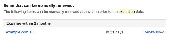 If you decide to manually renew the domain, we strongly recommend to not wait the last day to renew a domain, as there may be technical issues (either at the registry or registrar) that may cause the renewal to fail, or time-zone issues may lead to confusion.