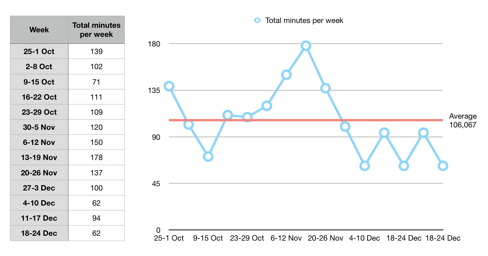 The experiment also proved wrong my other assumption: it doesn't take a lot of time to read the transcript. Here are the number of minutes that I spent, per week, on it.